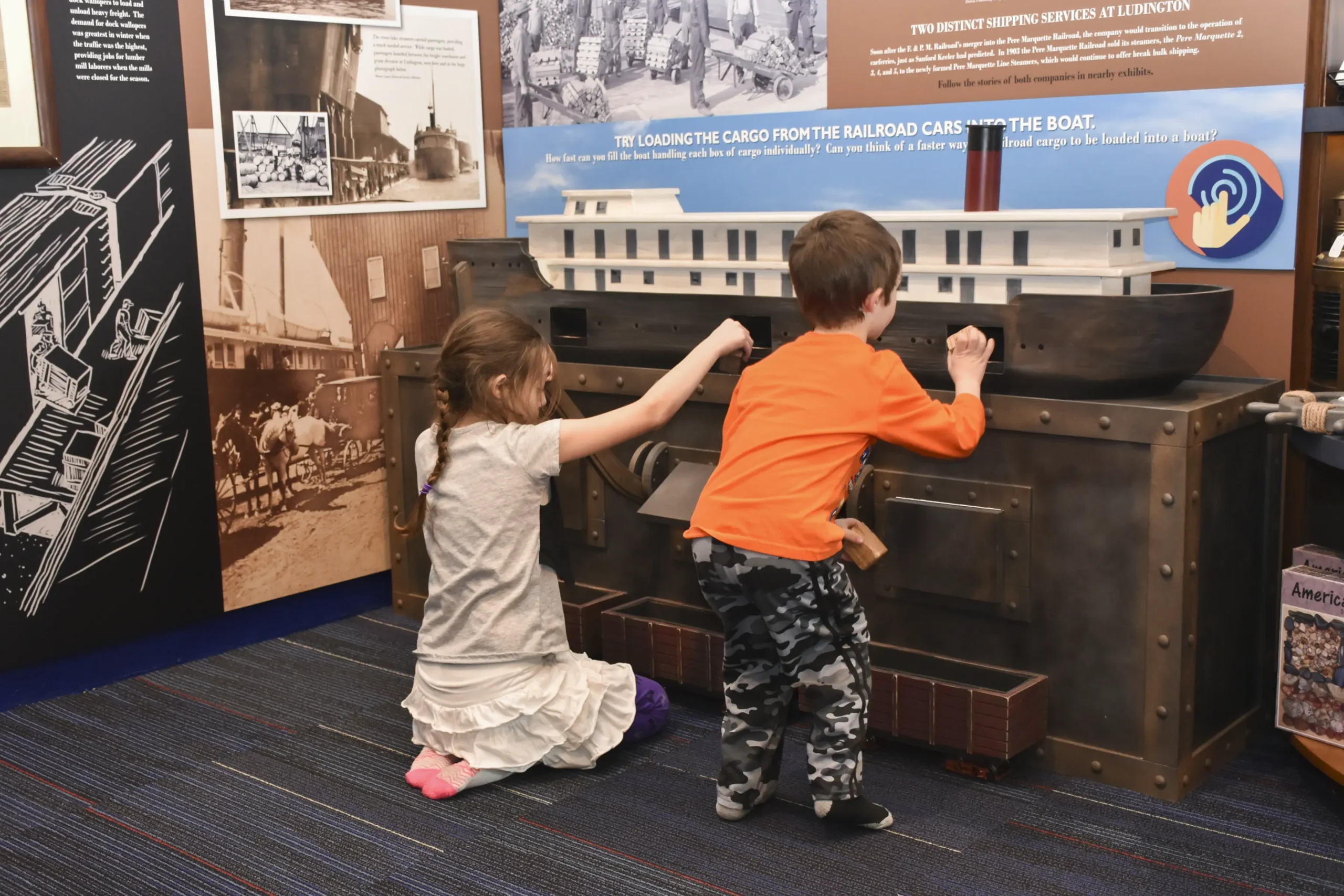 The Flint & Pere Marquette was one of the most important railroads in Michigan’s development, and its steamship line connected Ludington to markets across the Great Lakes. At this interactive exhibit, children can step into the shoes of a young 19th-century shipping entrepreneur — loading cargo onto one of Ward’s steamships and experiencing the logistics of Great Lakes commerce firsthand.